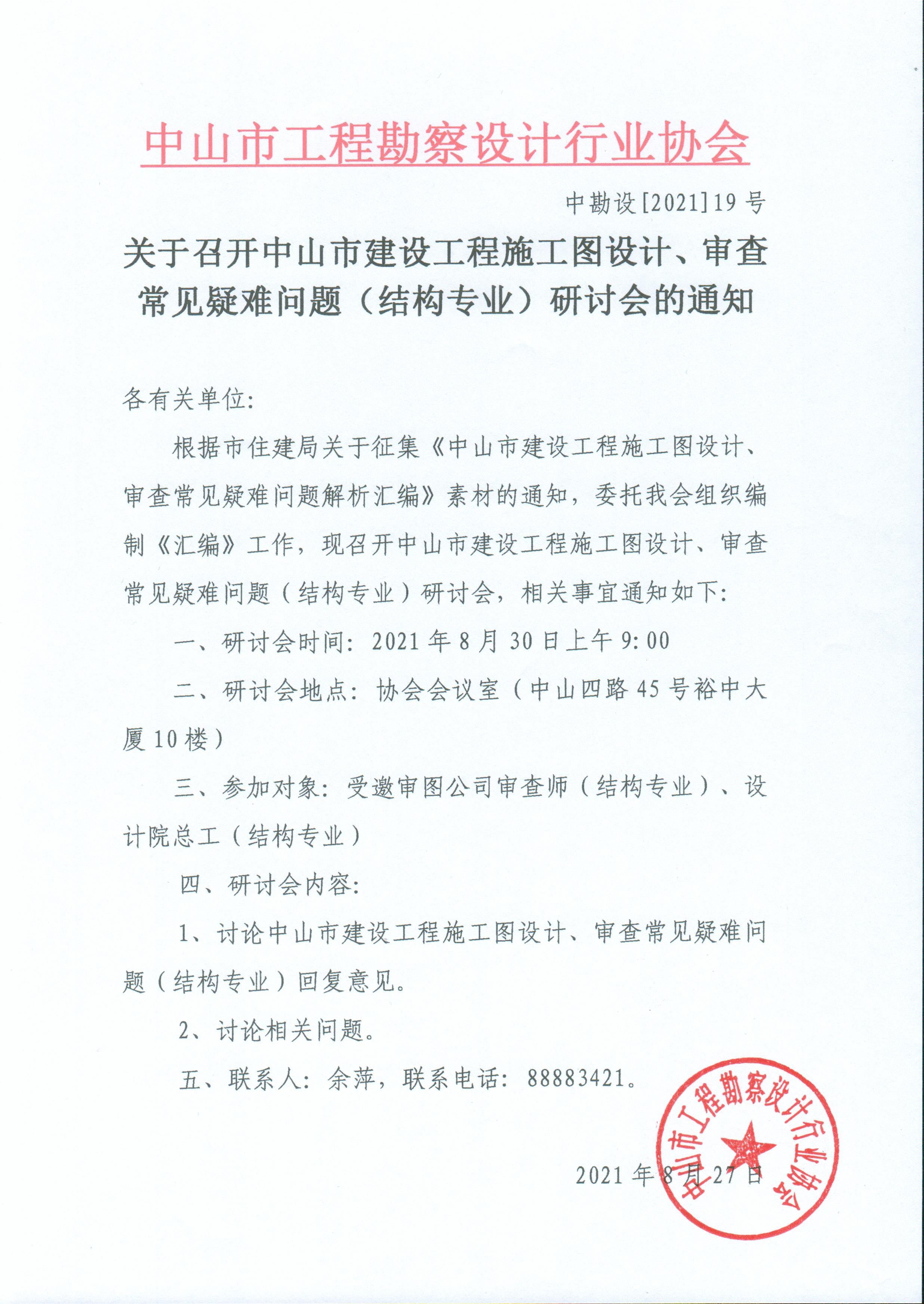 關(guān)于召開中山市建設(shè)工程施工圖設(shè)計、審查常見疑難問題(結(jié)構(gòu)專業(yè))研討會的通知