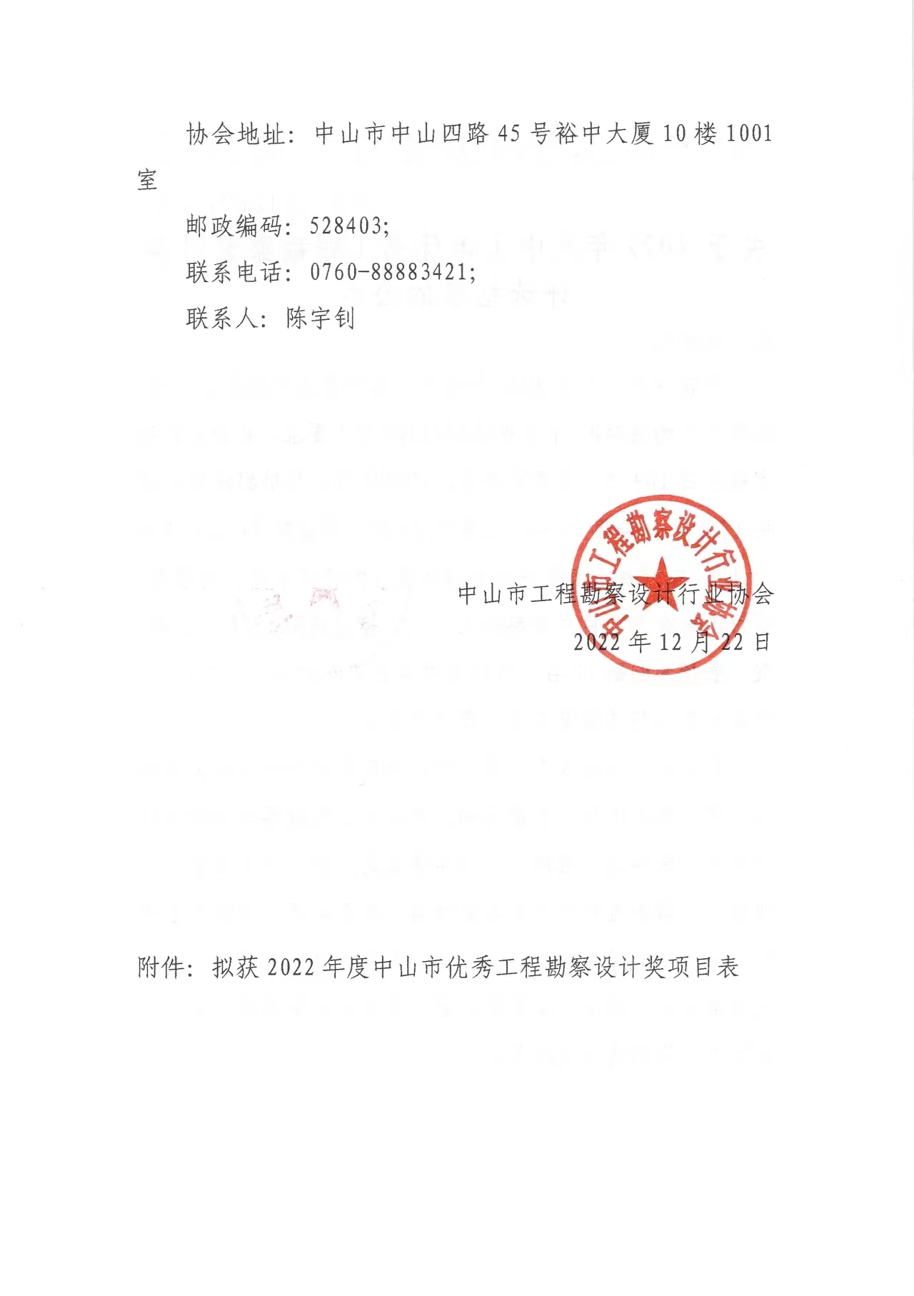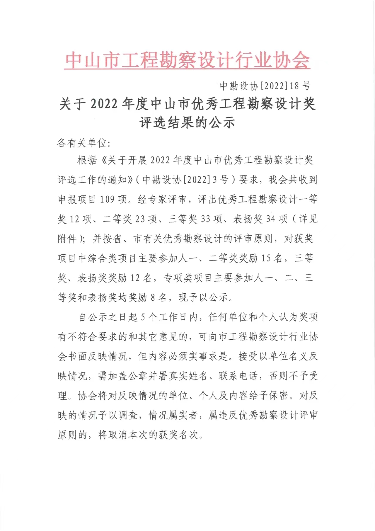 關(guān)于中山市2022年度優(yōu)秀工程勘察設(shè)計(jì)獎(jiǎng)評選結(jié)果的公示