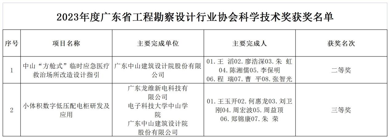 喜報!!!近日,廣東省工程勘察設(shè)計行業(yè)協(xié)會正式公告2023年度科學(xué)技術(shù)獎獲獎名單,經(jīng)本協(xié)會推薦,副會長單位“廣東中山建筑設(shè)計院股份有限公司”申報的兩個項(xiàng)目獲獎。