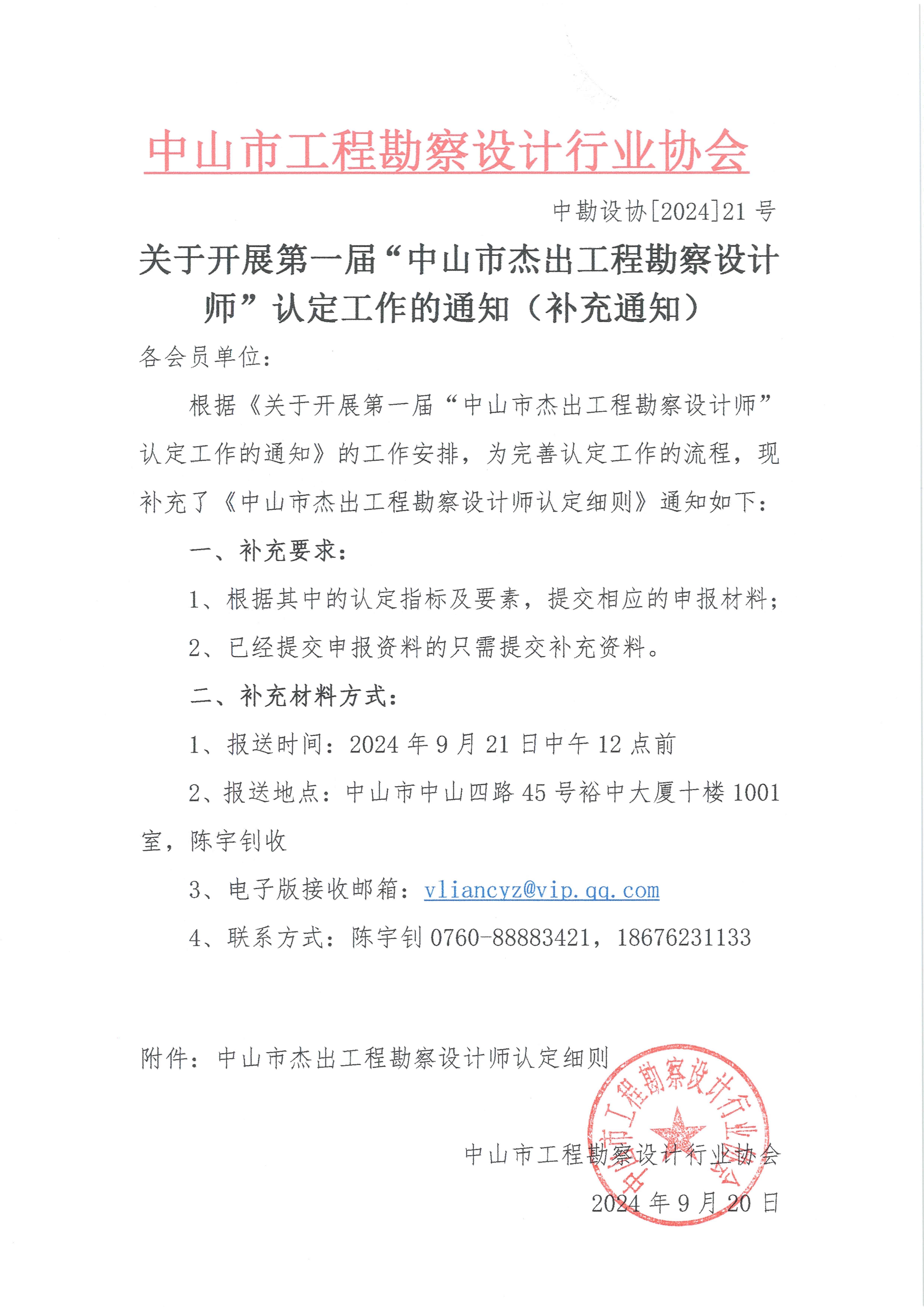 關(guān)于開展第一屆“中山市杰出工程勘察設(shè)計師”認(rèn)定工作的通知(補充通知)