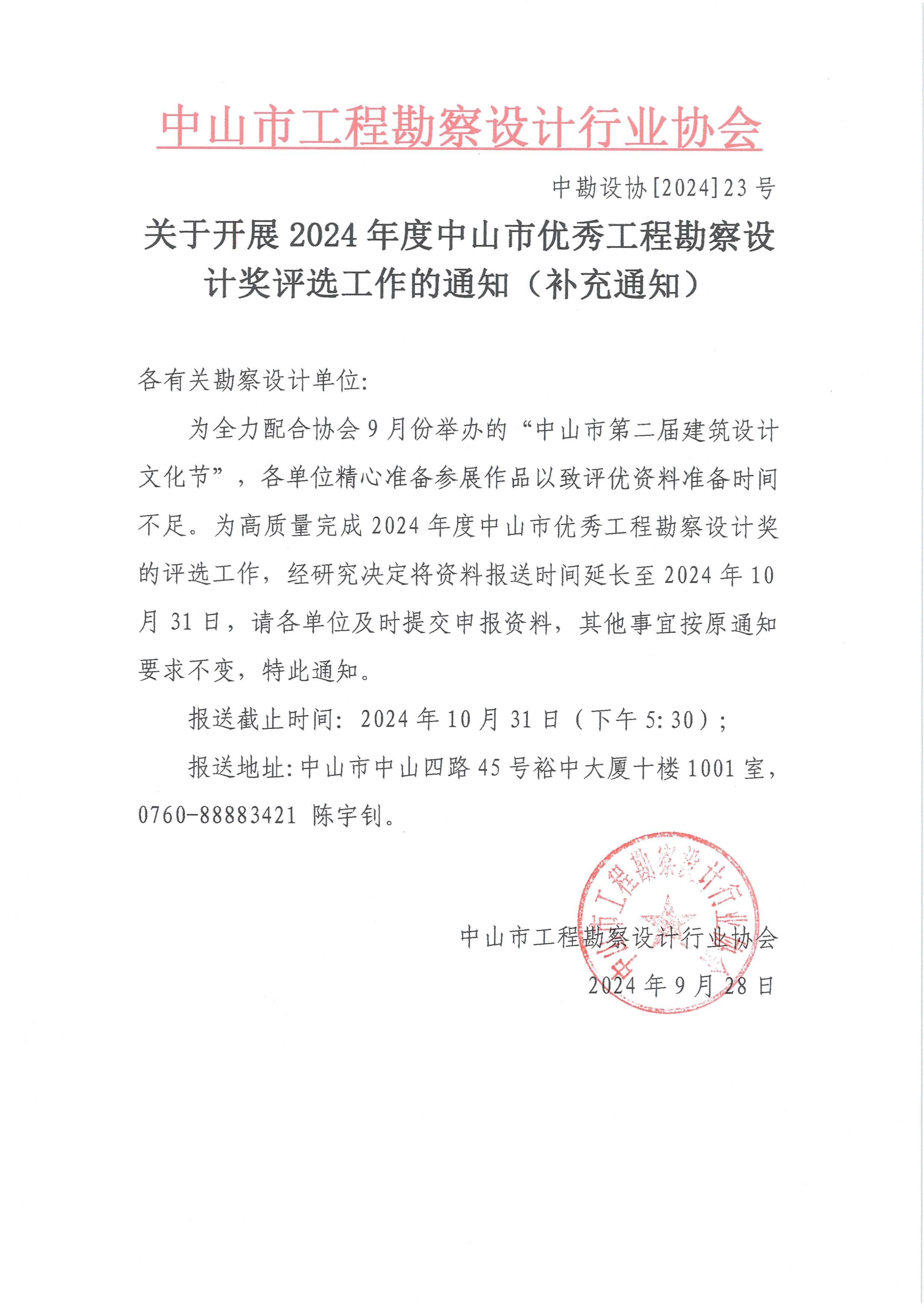關(guān)于開展2024年度中山市優(yōu)秀工程勘察設(shè)計(jì)獎(jiǎng)評(píng)選工作的通知(補(bǔ)充通知)