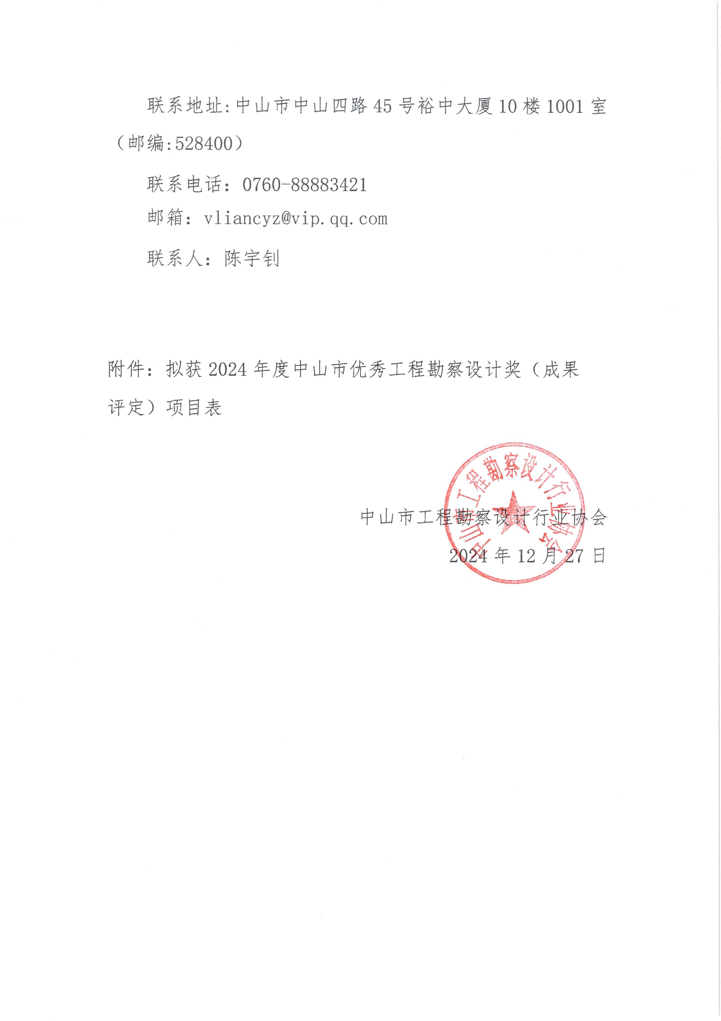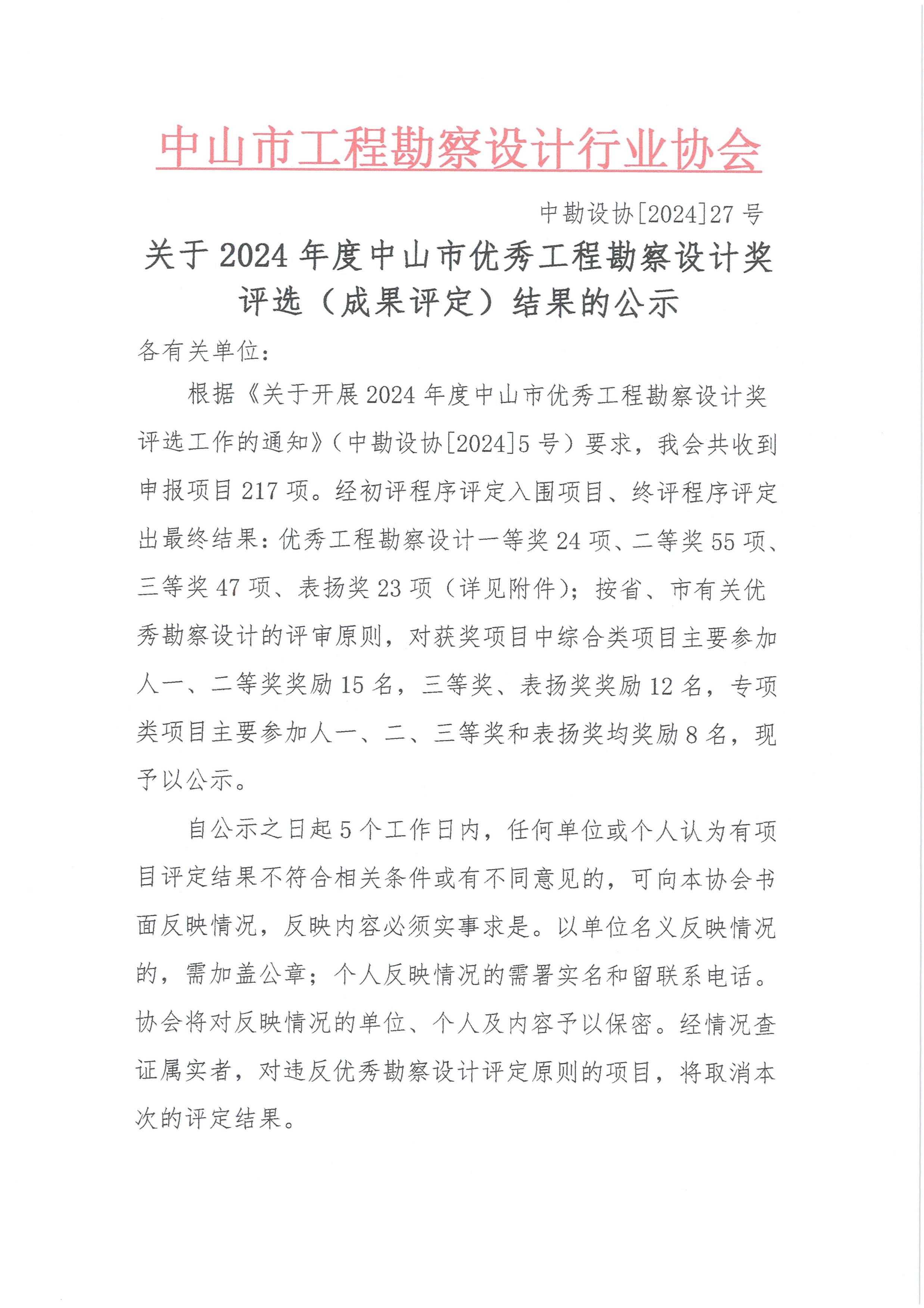 關于2024年度中山市優(yōu)秀工程勘察設計獎評選(成果評定)結果的公示