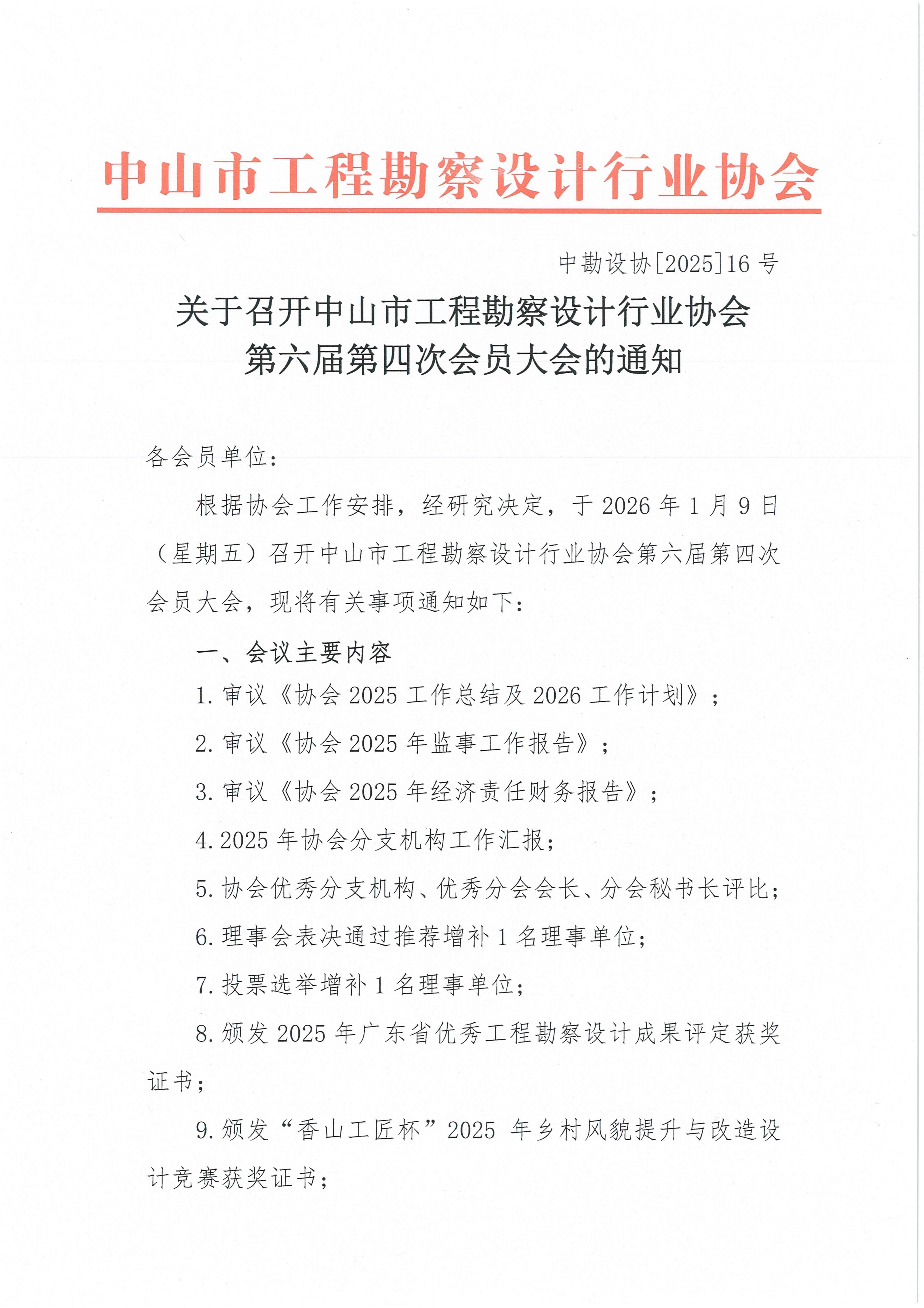 關(guān)于召開中山市工程勘察設(shè)計(jì)行業(yè)協(xié)會(huì)第六屆第四次會(huì)員大會(huì)的通知