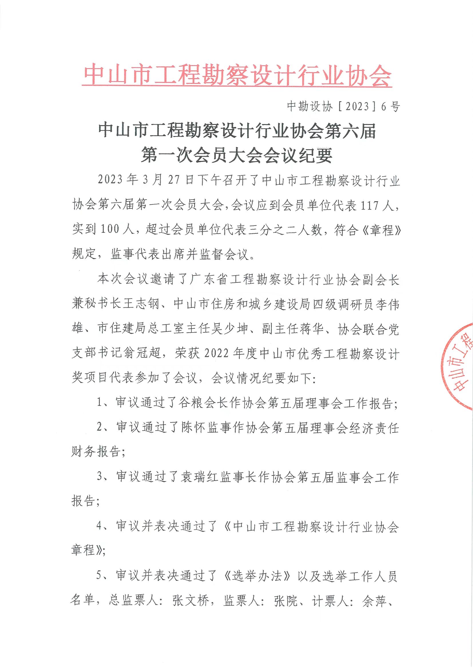 中山市工程勘察設計行業(yè)協(xié)會第六屆第一次會員大會會議紀要